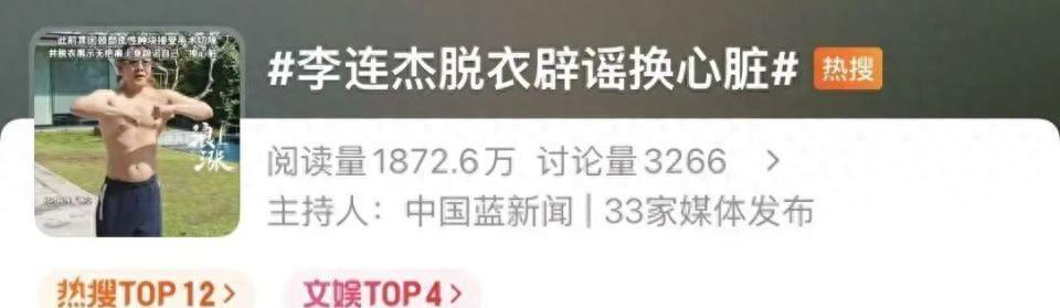 11日,“李连杰脱衣辟谣换心脏”冲上热搜。